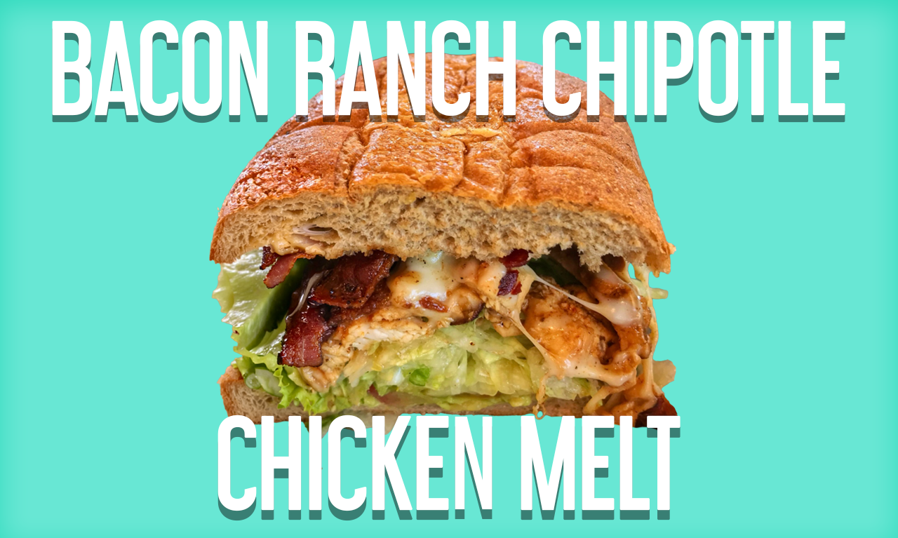 Warmed chipotle seasoned sliced chicken breast topped with pepper jack cheese & crispy bacon, and then drizzled with ranch dressing & pressed with parm crust.